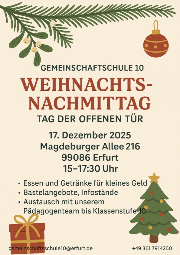 Am Mittwoch, 17. Dezember zwischen 15 und 17.30 Uhr, laden Schüler und Pädagogen der Gemeinschaftsschule 10 alle Interessierten zu einem stimmungsvollen Adventsnachmittag in die Schule Magdeburger Allee 216 ein.