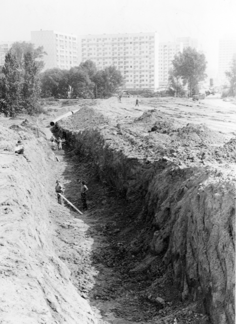 Das zweite Bild zeigt Erschließungsarbeiten in der Warschauer Straße. Die Y-Bauten standen bereits (links im Bild). Die rechte Seite wurde gerade erst erschlossen und für die Bebauung vorbereitet.