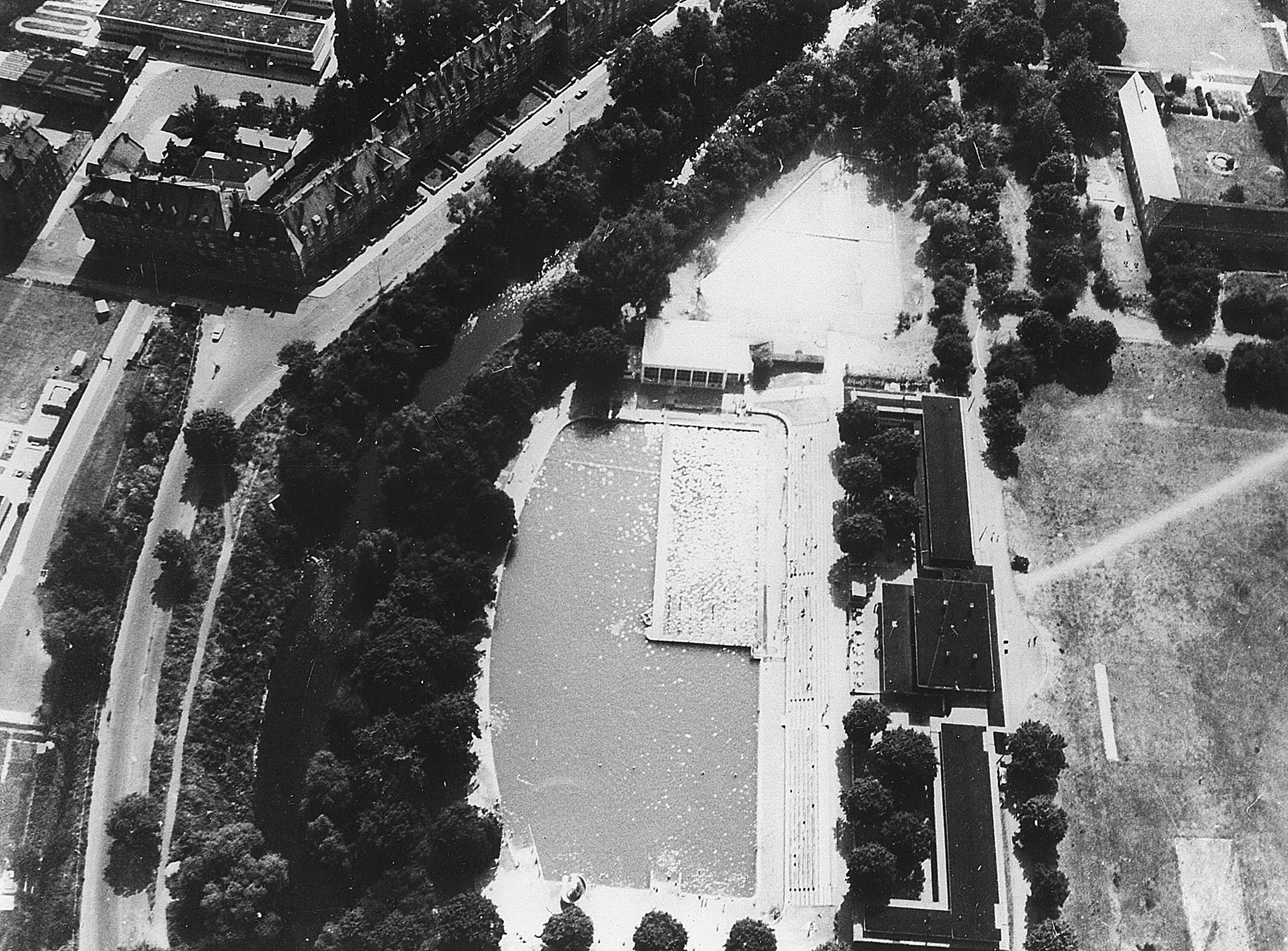 Das historische Eingangsgebäude, 1929 erbaut, war ein 114 Meter langes, symmetrisches Haus mit ausladenden flachgeneigten Dächern, horizontalen Gesimsen und Fensterreihen. Der zweigeschossige Mittelteil beherbergte im Erdgeschoss den Kassenbereich und ein Restaurant, das zur Badseite hin voll verglast war, und im Obergeschoss eine Wohnung. Parkseitig war ihm eine flachgedeckte Pfeilerhalle vorgelagert. Rechts und links waren die Umkleidehallen für Frauen und Männer untergebracht, die durch Oberlichter nach dem Vorbild des Hauses am Horn in Weimar belichtet waren. An deren Enden schlossen sich zur Badseite rechtwinklig abknickende Seitenflügel für die Duschräume an, die eine obere Liegeterrasse umfassten. Das zirka 100 m lange und 55 m breite Schwimmbecken war axial zum Eingangsgebäude angeordnet und lag einige Meter tiefer, wobei der Höhenunterschied durch eine 12-stufige Tribünenanlage mit vier Treppen überwunden wurde.