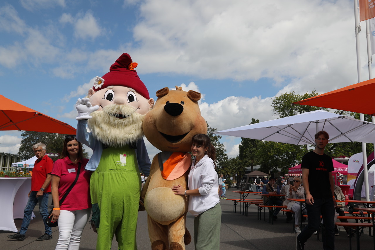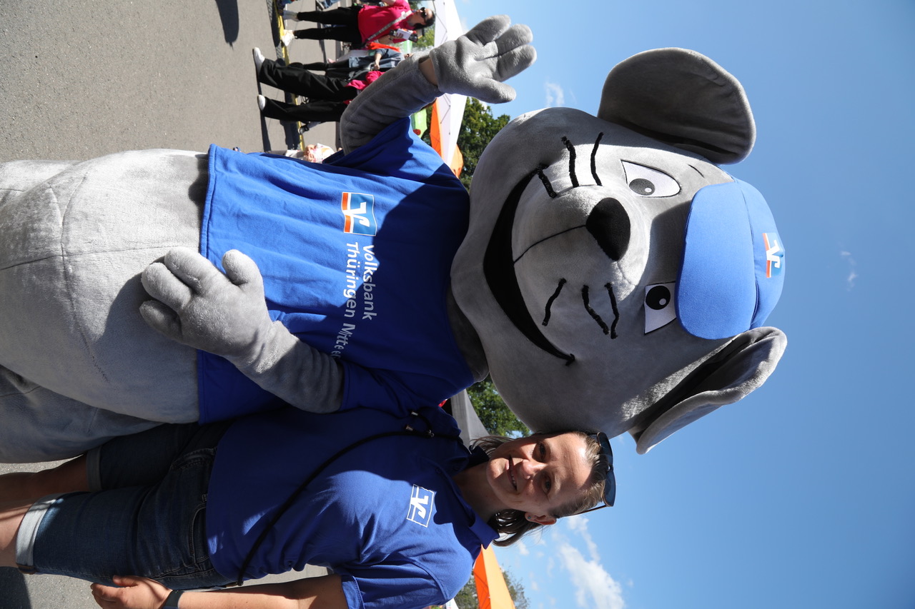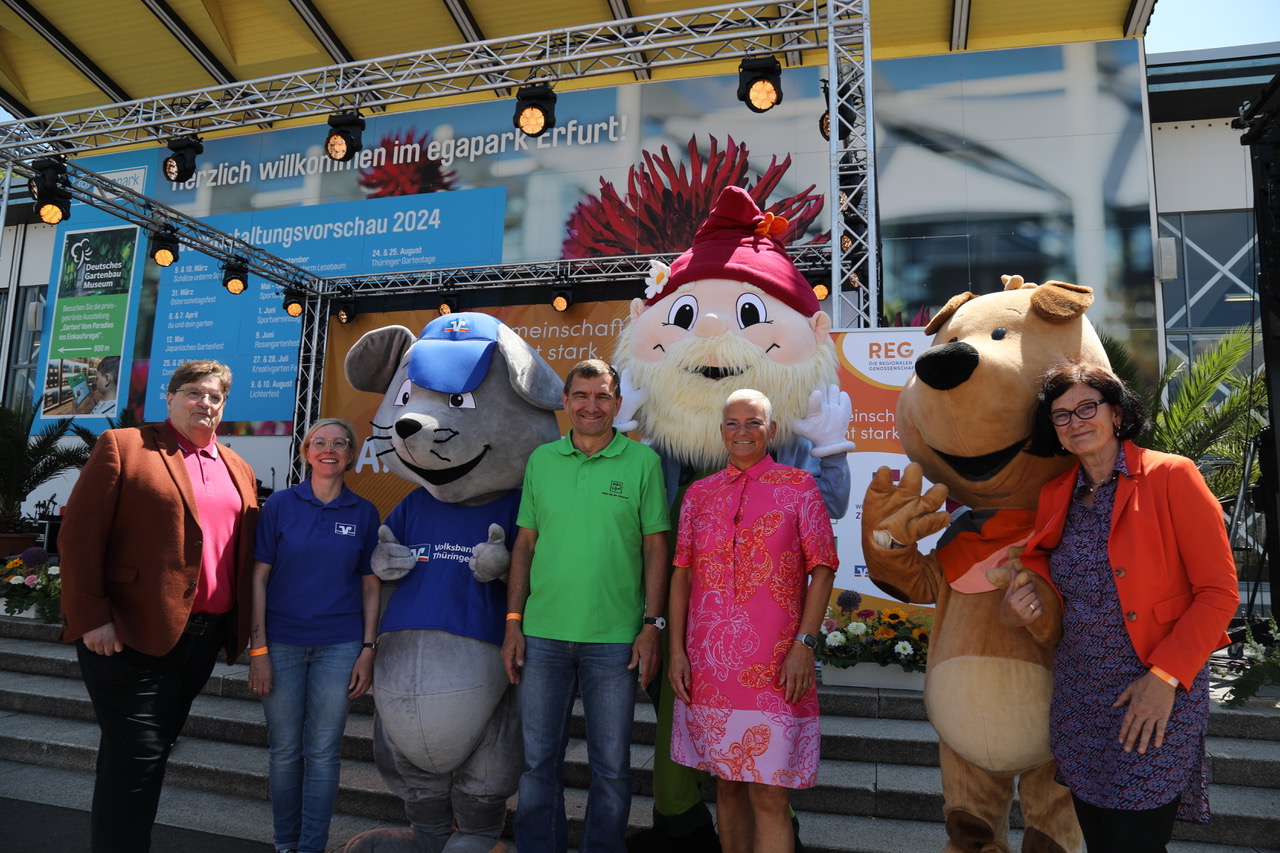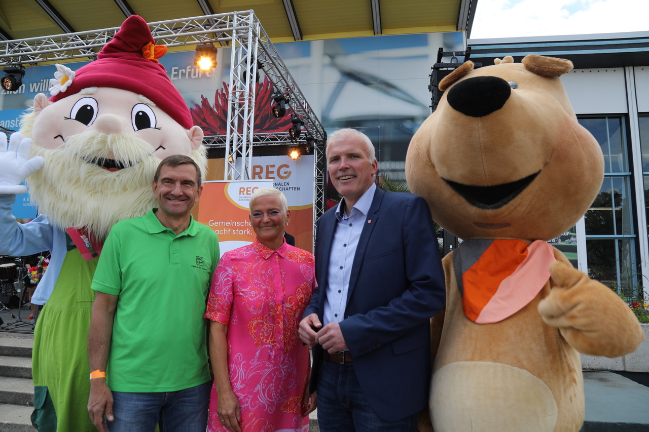 Die Maskottchen Zwerg Erno von der WBG Zukunft, Maus Eckehart von der Volksbank Thüringen Mitte und der Hund Filu von den Regionalen Genossenschaften waren beliebte Selfie-Motive der Besucher.