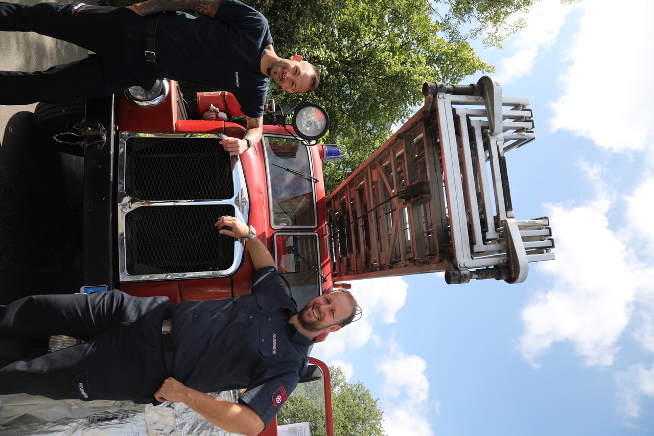 Kameraden Freiwilliger Feuerwehren mit historischem Einsatzfahrzeug gewährten Einblick in die Technik vergangener Zeiten.
