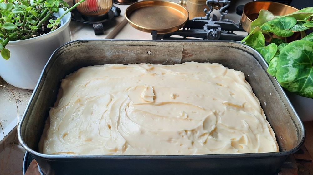 Für den Teig alle Zutaten miteinander verkneten, auf ein ausgelegtes Blech (24x35cm) drücken, den ausgekühlten Pudding cremig aufschlagen, auf den Teig streichen.
