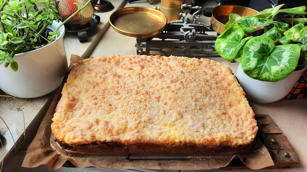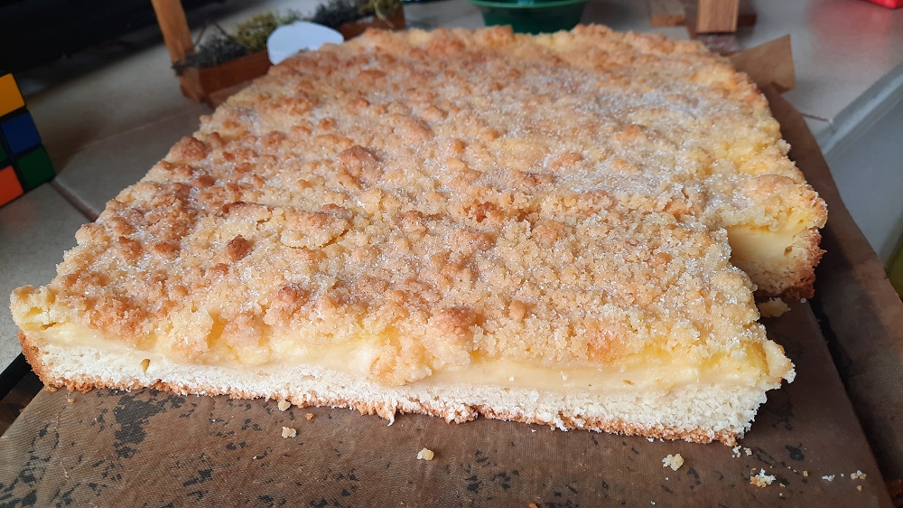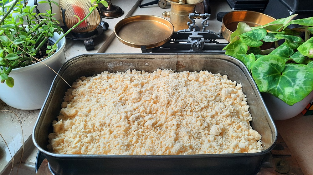 Streusel kneten und auf dem Pudding verteilen. Backen bei 175 Grad ca. 45-50 Minuten.