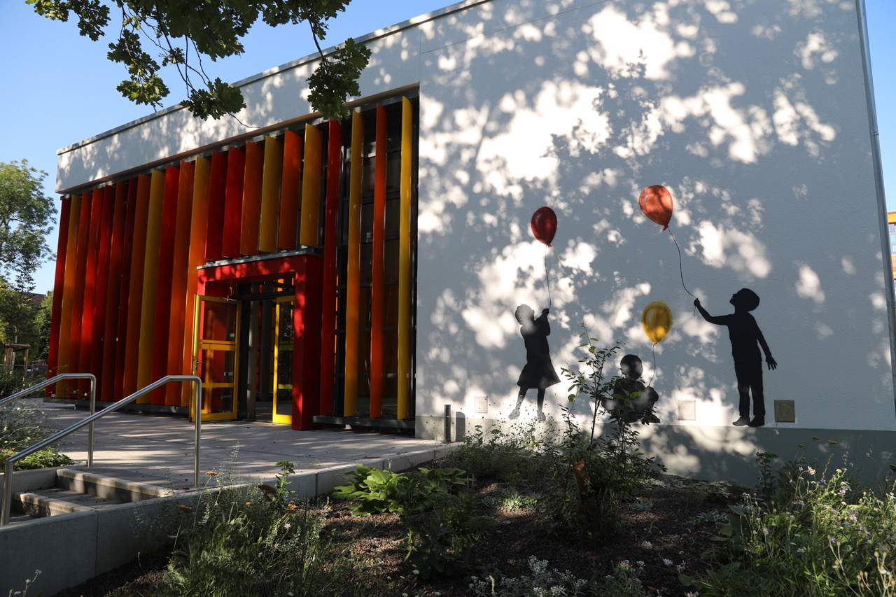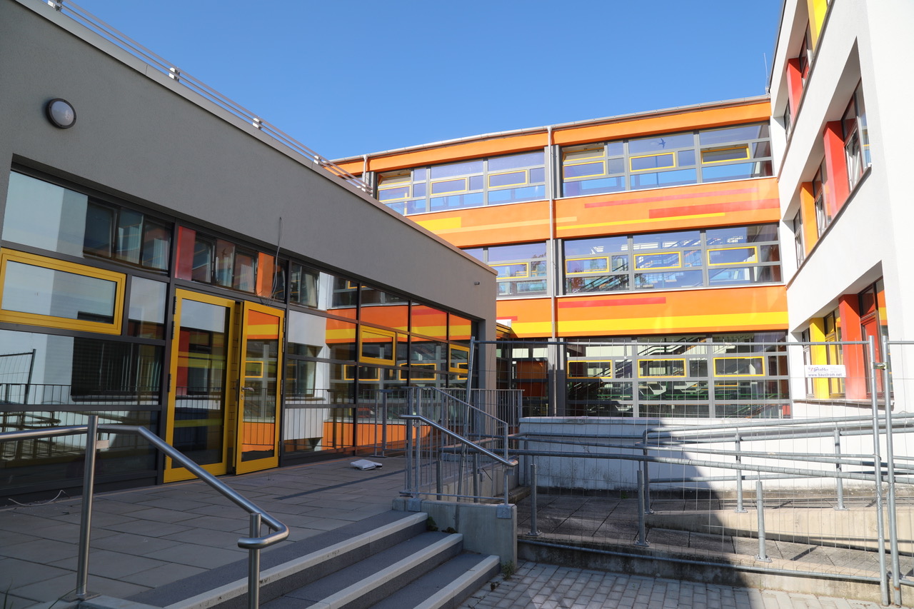 Der moderne Mensa-Anbau beherbergt eine Ausgabeküche, von der aus Essen für die rund 300 Schülerinnen und Schüler ausgegeben werden. Ein großer Speisesaal, der multifunktional auch als Eventlocation für schulische Veranstaltungen genutzt werden wird, hält moderne Technik bereit. Die großen, von orangen – gelb – roten vertikalen Lamellen beschatteten Glasfronten geben den Blick frei auf bereits jetzt schön angelegte Staudenbeete und eine Terrasse, ausgestattet mit großen Sonnenschirmen. Davor befinden sich Rampen, die einen barrierefreien Zugang ermöglichen.