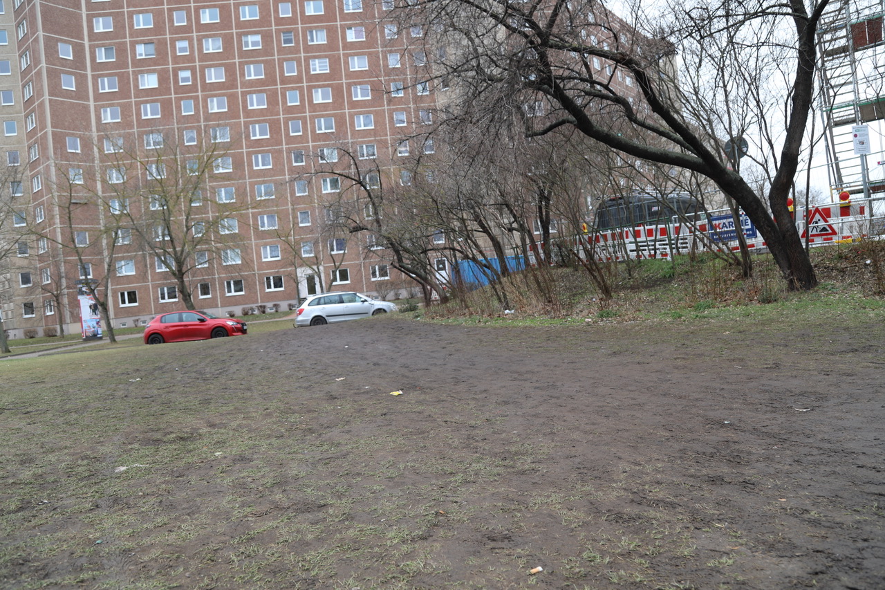 Noch ist der Gehweg mitsamt Verschwenkung nicht wieder freigegeben, da hier noch ein Gerüst für notwenige Dachsanierungsarbeiten an der Umformerstation positioniert ist. Viele Anwohner nutzen die daneben liegende Grünfläche statt des unweit entfernten breiten gepflasterten Gehweges, um die Straßenbahn-Haltestelle zu erreichen. Das hat nicht nur einen Trampelpfad, sondern einen mehrere Meter breiten Streifen mit zerstörter und sich nach Beurteilung durch Gartenbau-Fachleute nicht wieder regenerierbarer Grünfläche zur Folge. Das bedeutet, dass hier eine Neugestaltung erforderlich wird. Die dadurch gebundenen finanziellen Mittel stehen dann für andere Aufgaben im Wohngebiet nicht zur Verfügung.