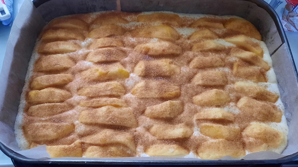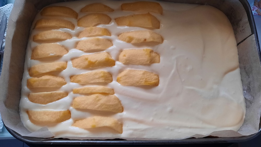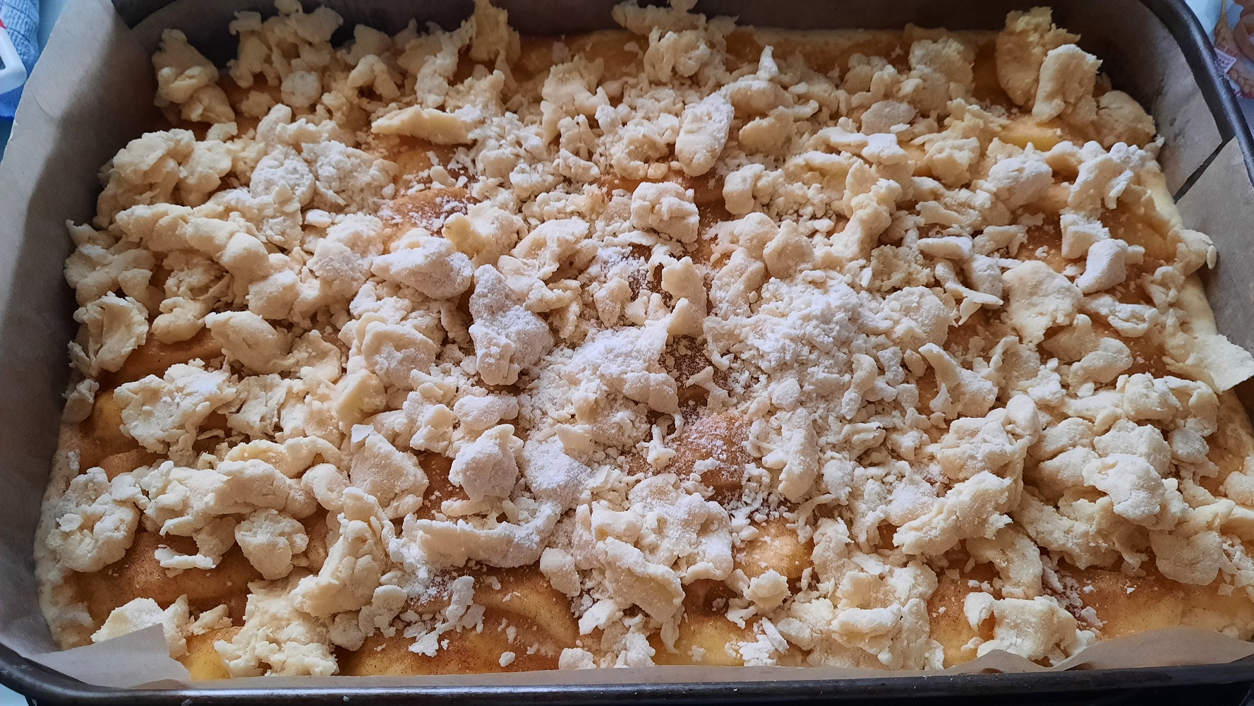 Teig herstellen, halbieren, eine Hälfte als Boden in eine ausgelegte oder gebutterte Form (24x35cm) drücken, in die andere Hälfte 2 EL Mehl für die Streusel einkneten, alle Zutaten der Creme verrühren und auf den Boden geben, Äpfel klein schneiden, mit Zucker und Zimt mischen, auf die Creme legen, Streusel darüber streuen, bei 160°C Ober/Unterhitze ca. 45min backen mit Vanillezucker bestreuen und abkühlen lassen.