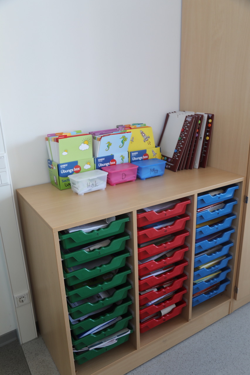 Die individuellen Arbeitsmaterialien der Kinder – übersichtlich geordnet, jederzeit griffbereit.