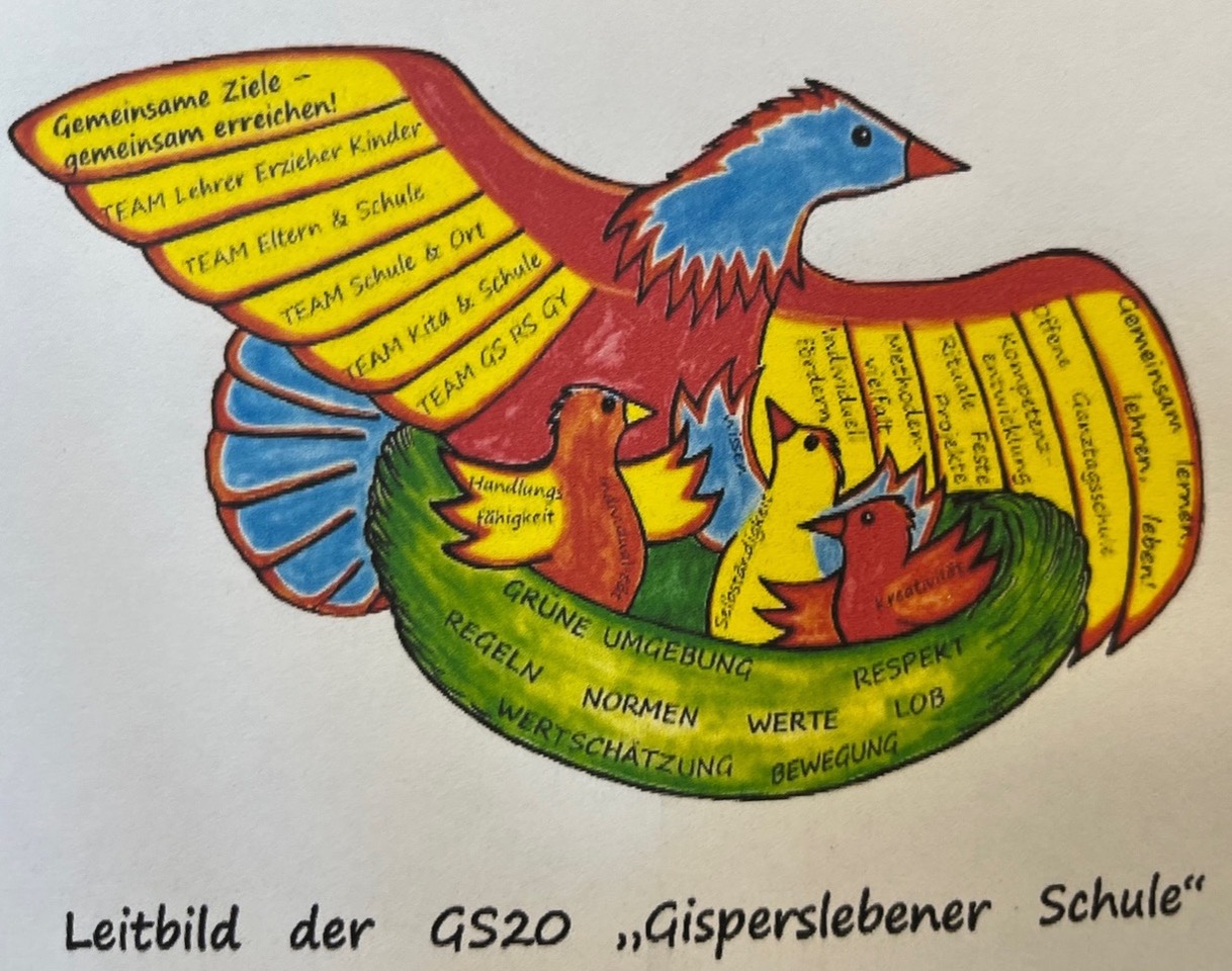 Es gibt einen ganz besonderen Vogel, der die Botschaft des Gisperslebener Schulkonzeptes symbolisiert: Eine Zeichnung, die all das zusammenfasst, was an Wesentlichem hier vermittelt, gelernt, erarbeitet wird. Und: Die Schüler fördert und schützt, sorgt aber gemeinsam mit den Eltern und Partnern der Schule auch dafür, dass die Kleinen „flügge“, selbständig und handlungsfähig werden und in den nächsten Lebensabschnitt entlassen werden können.