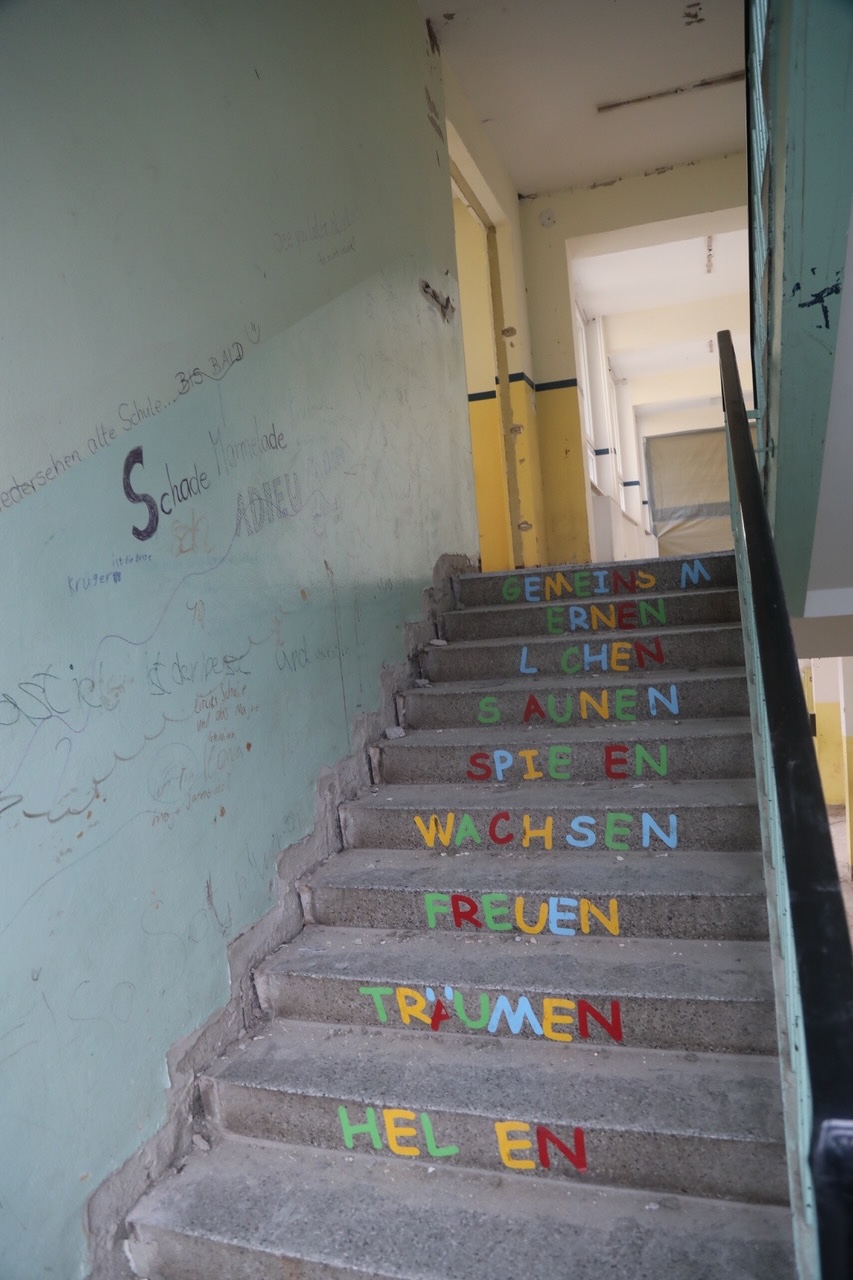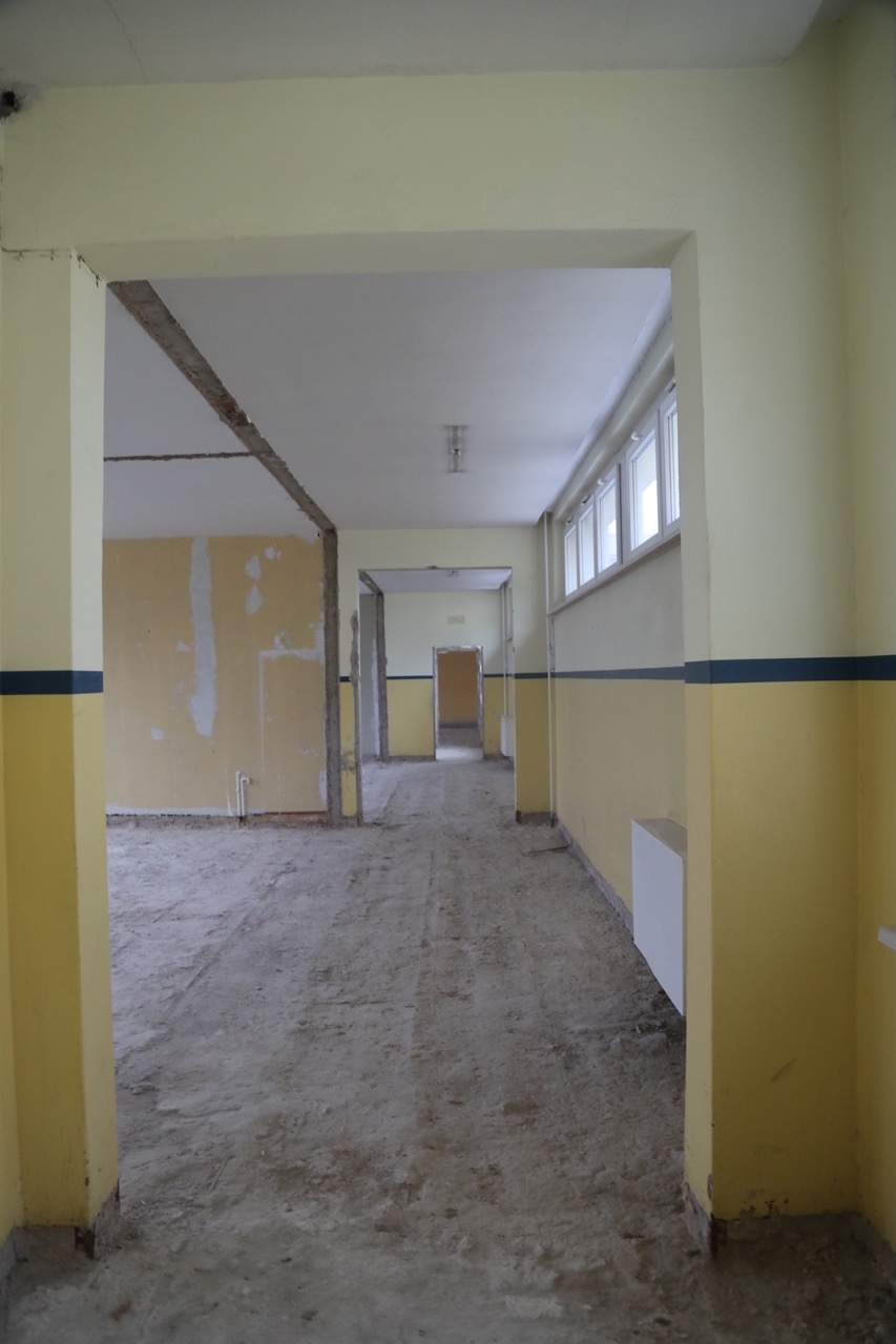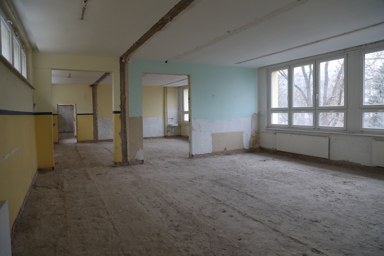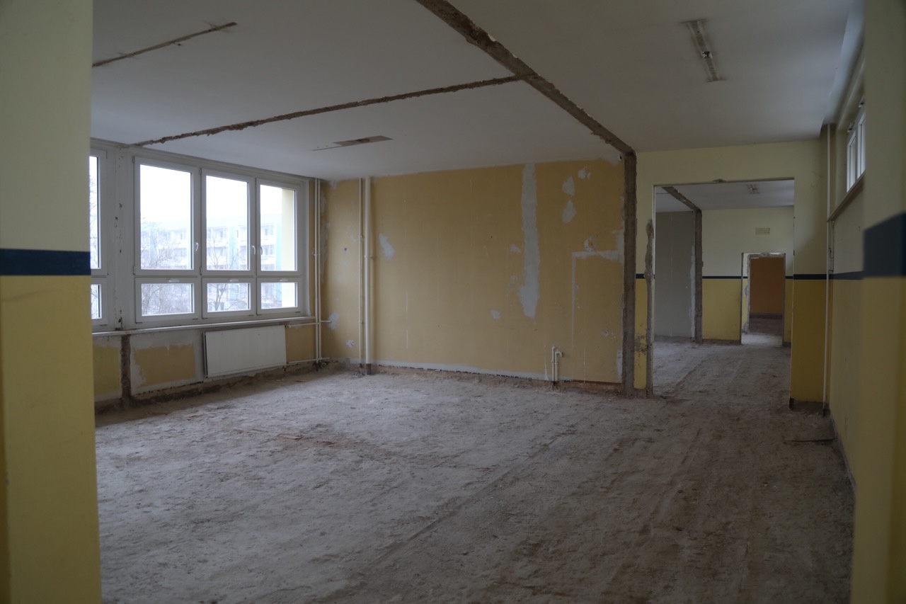 Um Verbesserungen schaffen zu können, war zunächst all das zu entfernen, was alt und technisch überholt war: Bodenbeläge, Tapeten, Elektro- und Sanitärinstallationen u.a.m. Der Bereich der Gemeinschaftsschule ist nun also vollständig entkernt. Sobald das im benachbarten Gebäudeteil beheimatete Förderzentrum 5 ausgezogen ist, können die Arbeiten auch dort begonnen werden – voraussichtlich im April.