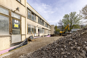 Seit Mai 2023 wird hier umfassend saniert, das umfasst sowohl das Gebäude als auch die Außenanlagen. Die Maßnahme mit einem Investitionsvolumen von 7 Millionen Euro soll bis Frühjahr 2026 abgeschlossen sein, so dass die Kinder wieder einziehen können.
