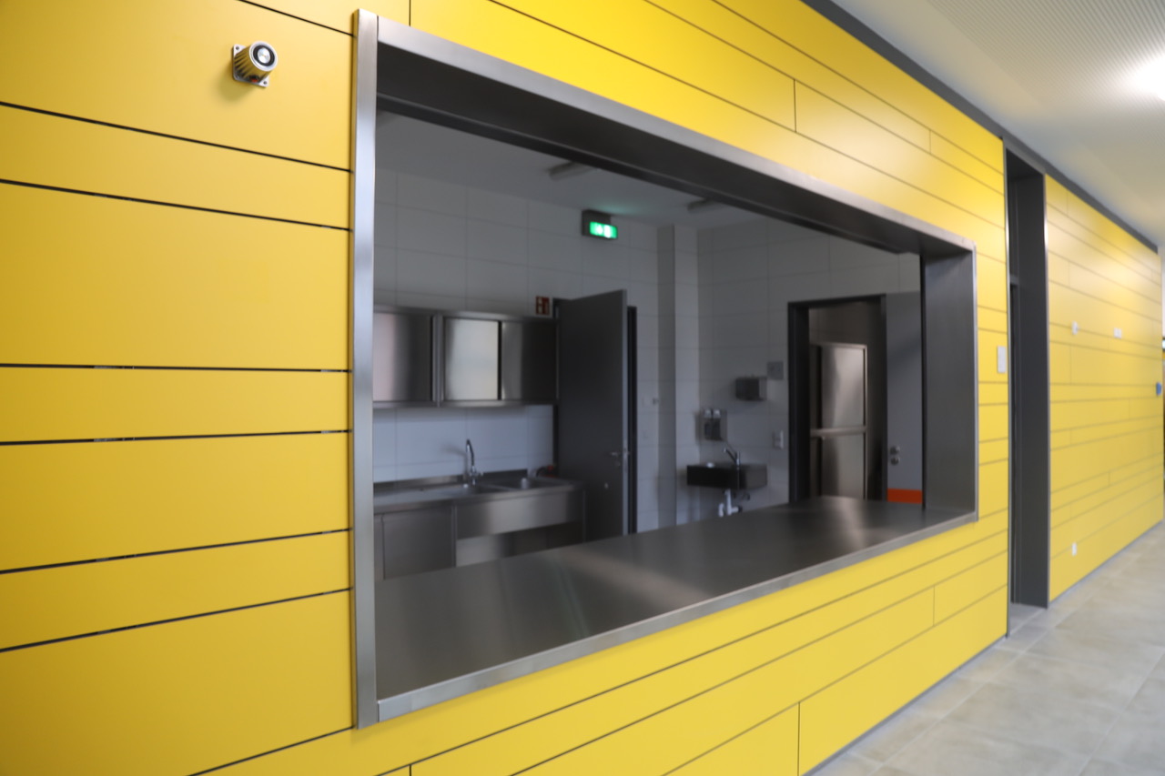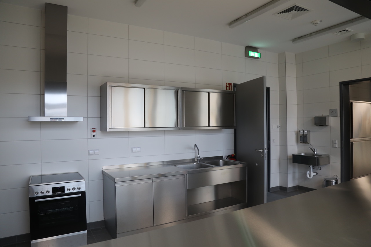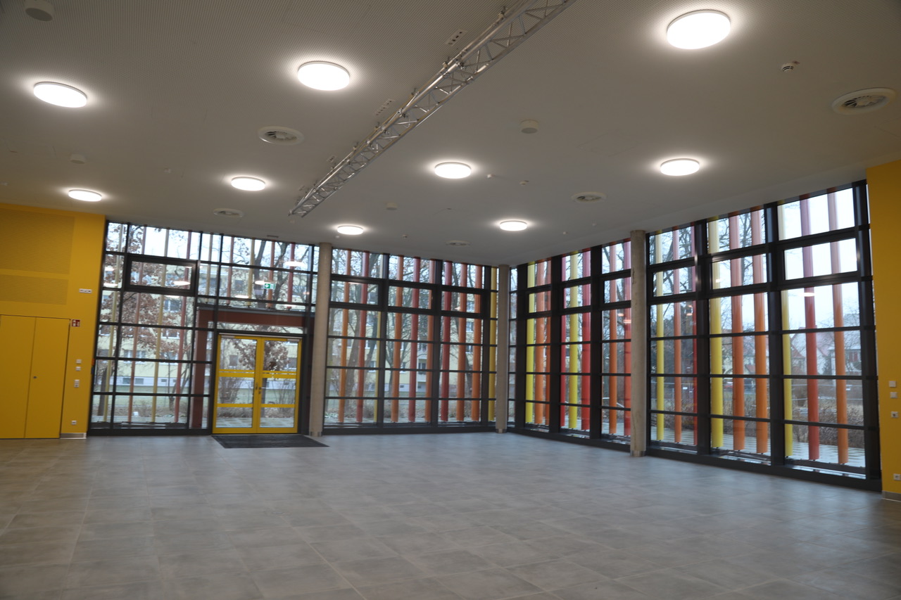 Alle Arbeiten inklusive Restleistungen sind bereits abgeschlossen. Eine Ausgabeküche, von der aus Essen für die rund 300 Schülerinnen und Schüler ausgegeben werden, ein lichtdurchfluteter Speisesaal, der multifunktional auch als Eventlocation für schulische Veranstaltungen genutzt werden wird, schön gestaltete Außenanlagen – all das erwartet Schüler und Pädagogen in absehbarer Zeit.