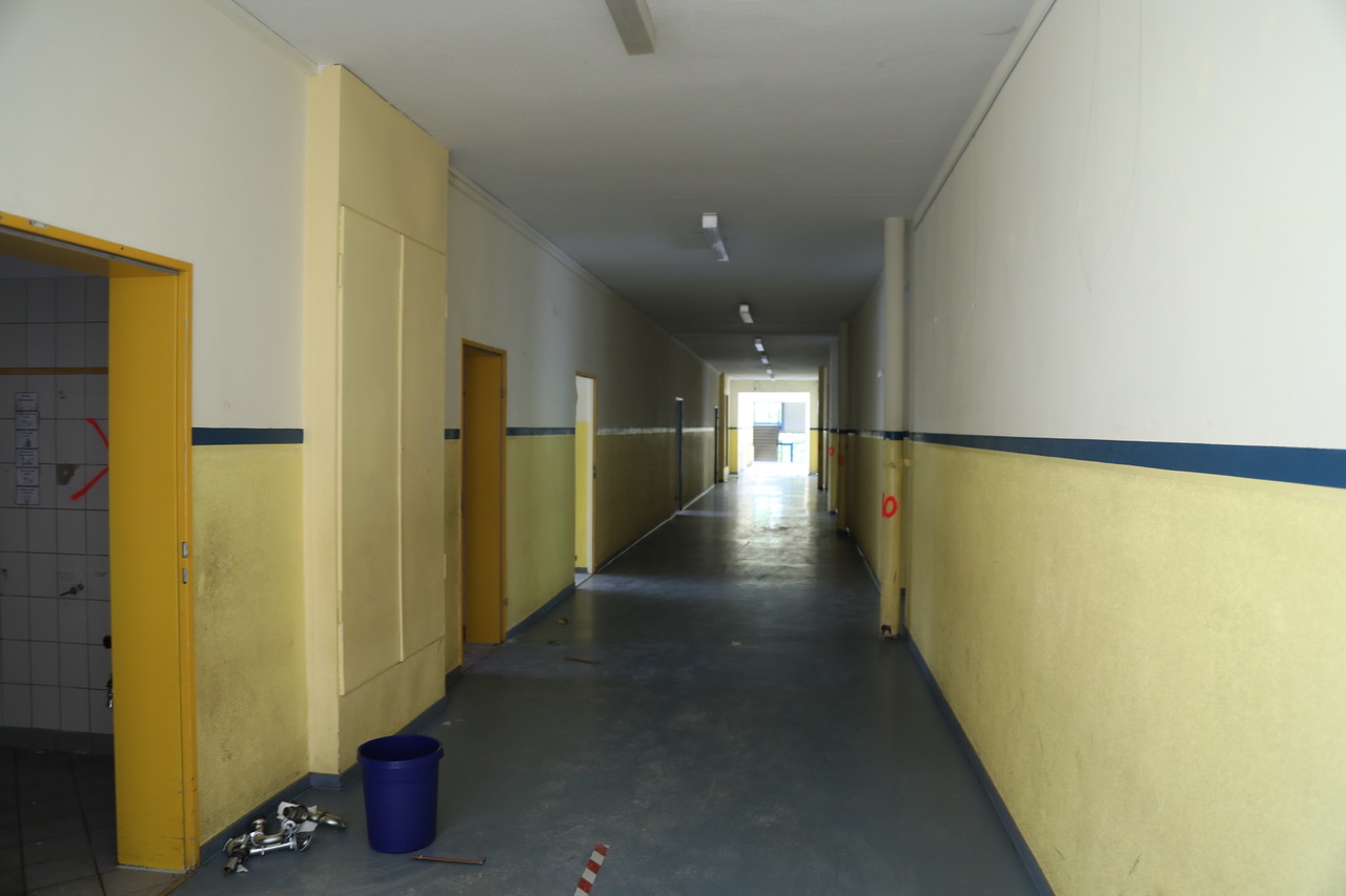 Um Verbesserungen schaffen zu können, ist zunächst all das zu entfernen, was alt und technisch überholt war: Bodenbeläge, Tapeten, Elektro- und Sanitärinstallationen u.a.m. Der Bereich der Gemeinschaftsschule ist bereits vollständig entkernt, an der Entkernung des benachbarten Gebäudeteils (Förderzentrum) wird mit Hochdruck gearbeitet.