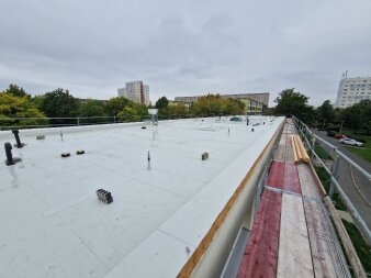 Ebenfalls wurde eine energieeffiziente Gefälledämmung eingebaut. Abschließend erhielt das Dach eine hochwertige Flächenabdichtung. Auch sämtliche Dacheinbauteile wurden im Zuge der Arbeiten erneuert.
